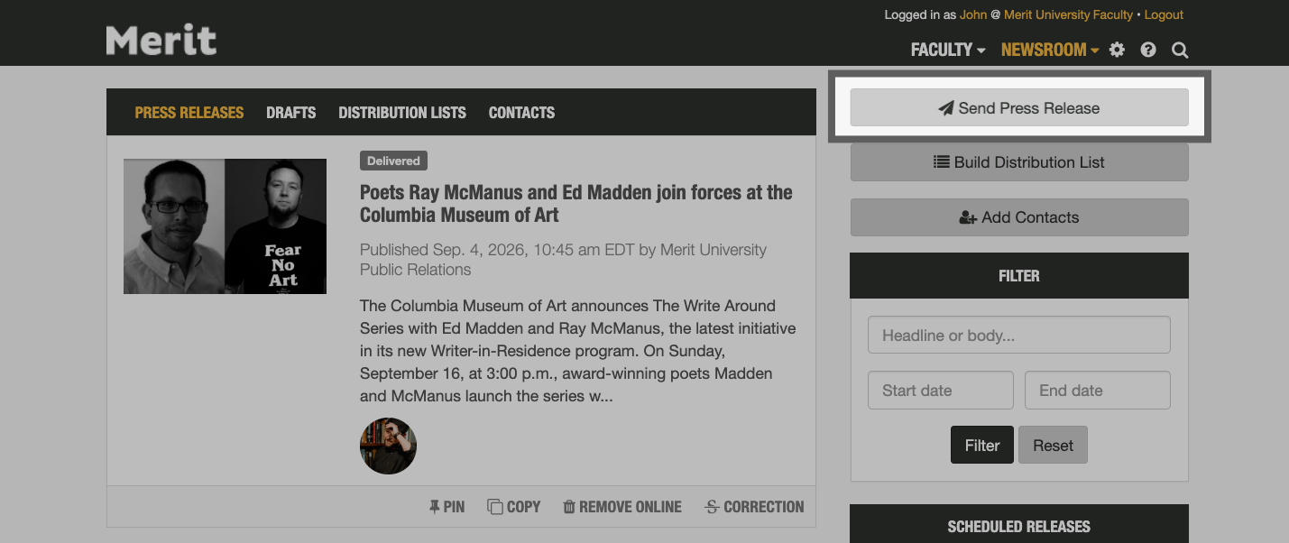 You can publish faculty press releases by logging into either your institution's primary Merit account, or your specialized Merit for Faculty account.